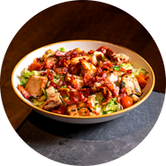 Fresh baby gem, chicken breast fillet roasted over charcoal with Caesar sauce, crispy bacon, parmesan and croutons.