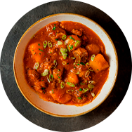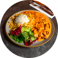 Slow-cooked chicken breast with homemade tomato sauce, mushroom and fresh cream. Served with rice and stick potato.