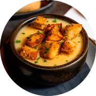 Freshly made soup served with bread and topped with crispy croutons.
