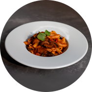 Slow-cooked beef ragu, homemade tomato sauce, and parmesan cheese.