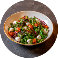 Mix leaf with virgin olive oil, fresh mozzarella, homemade pesto and tomato confit.